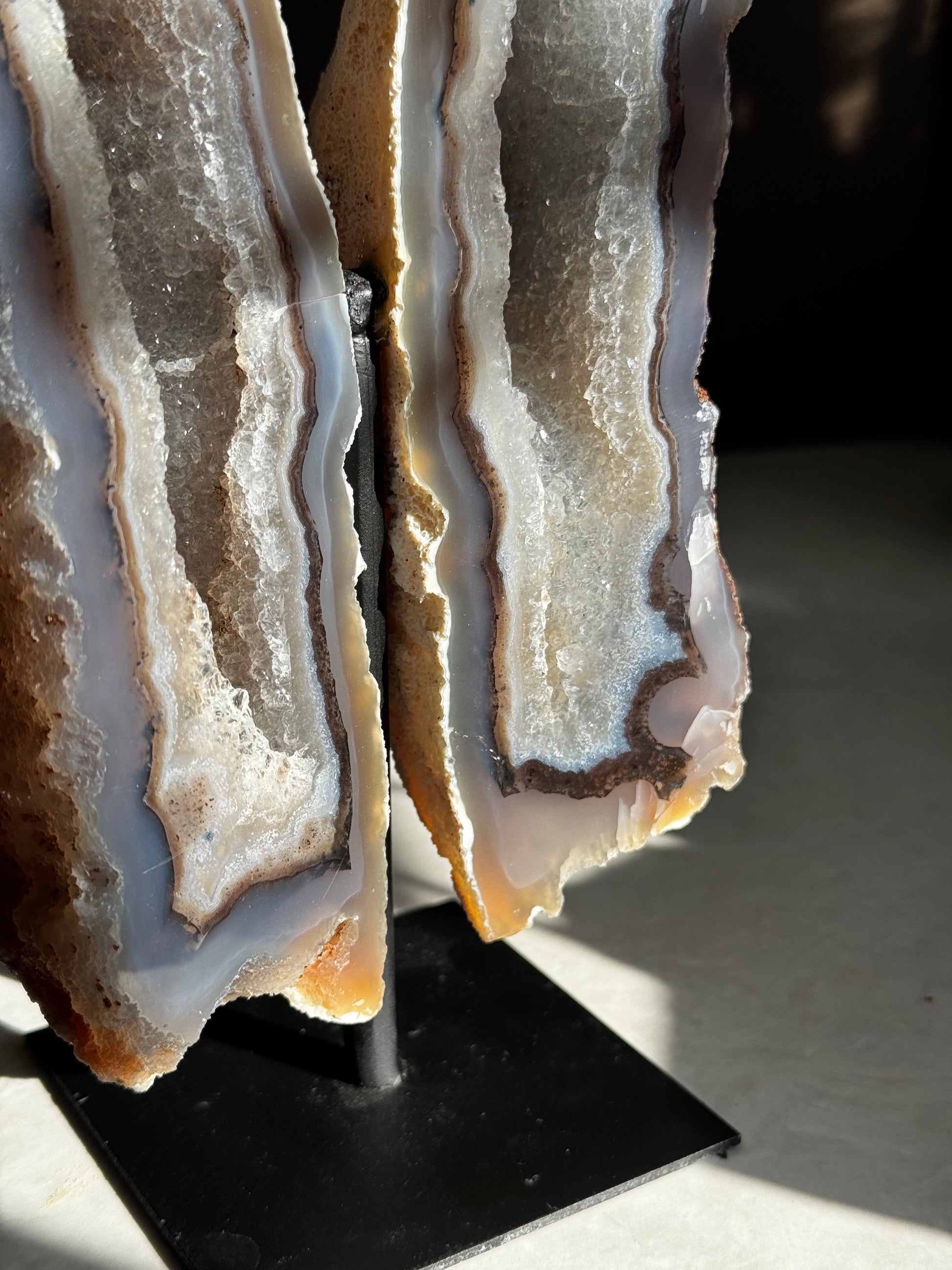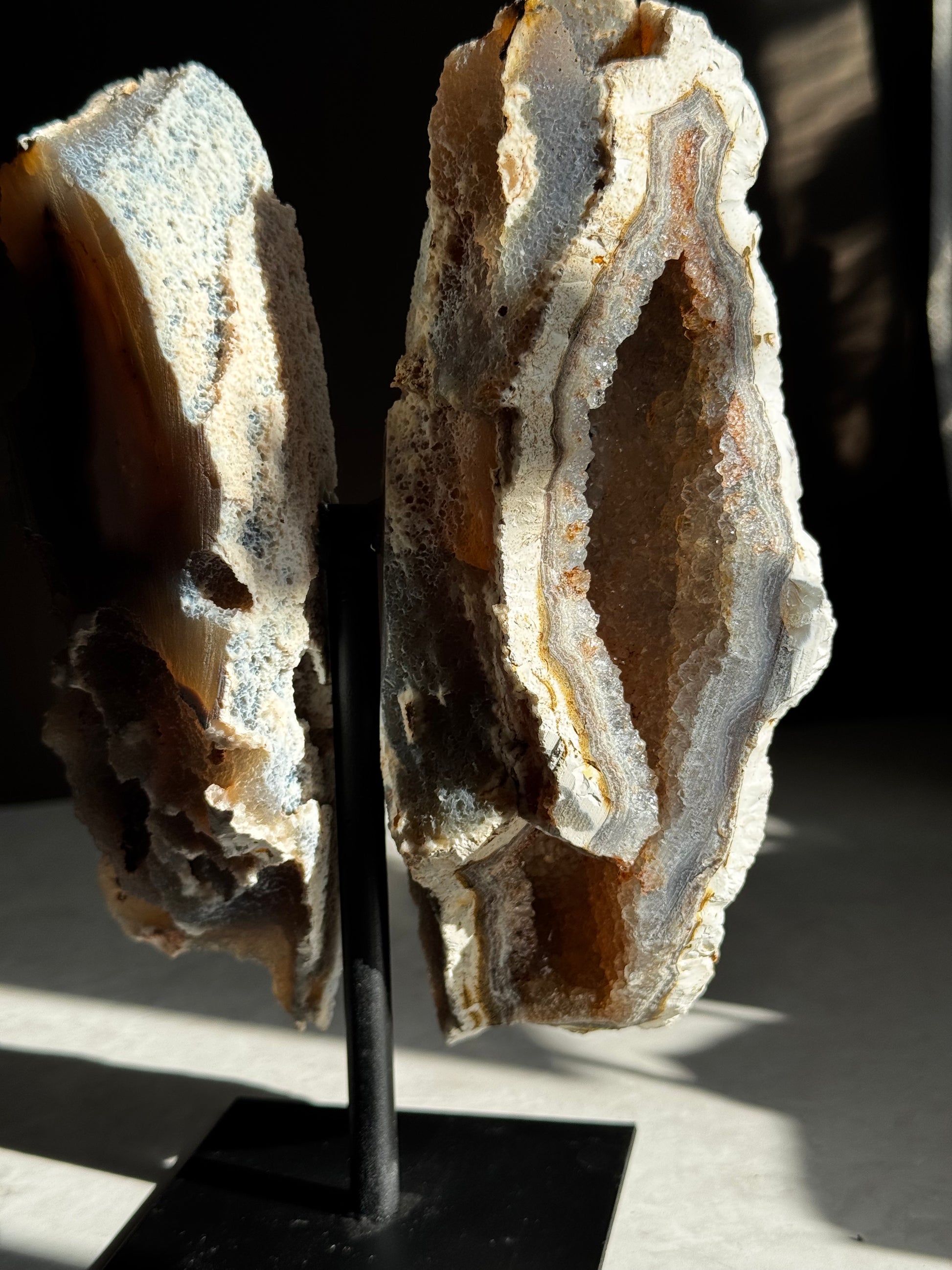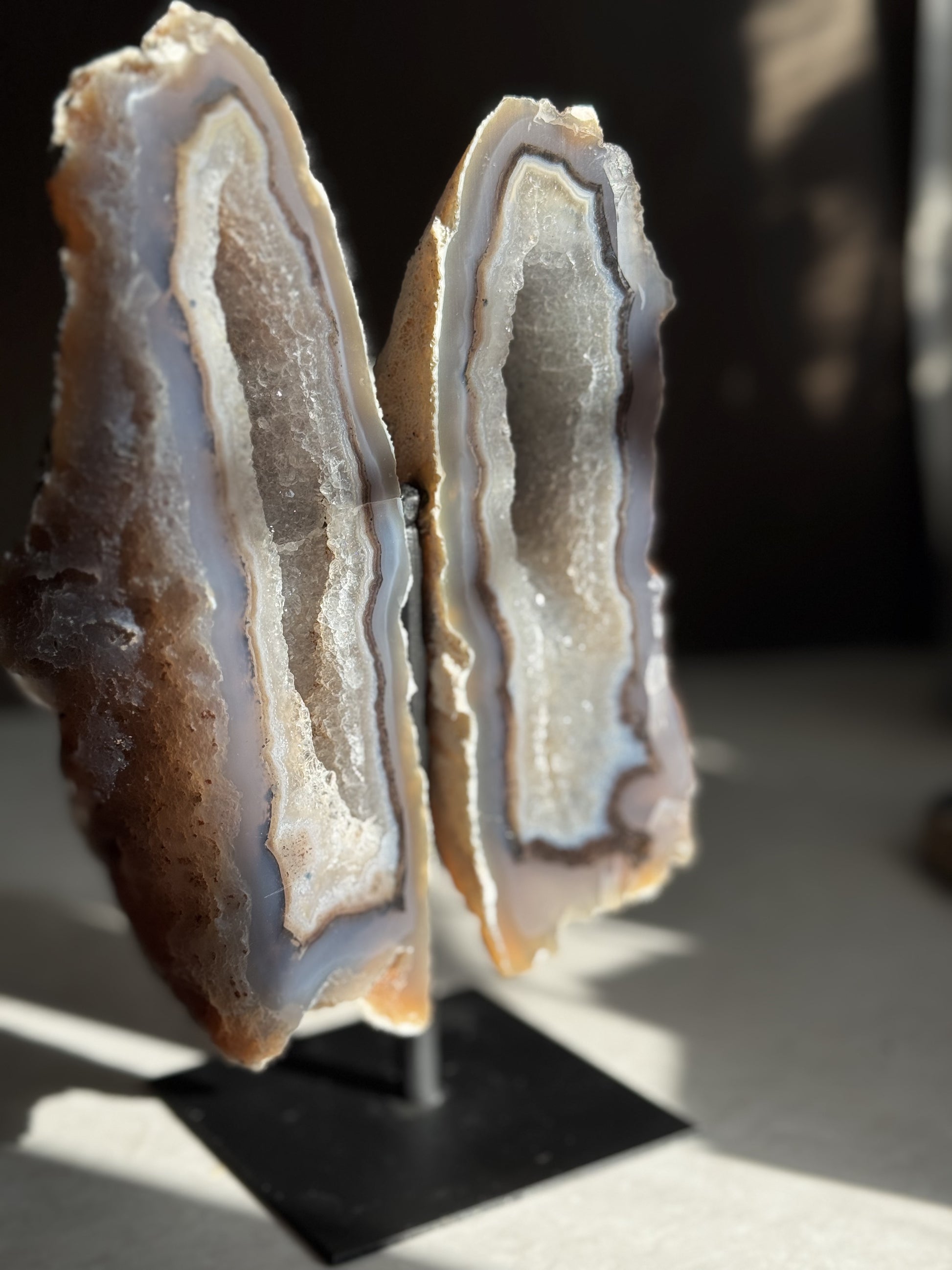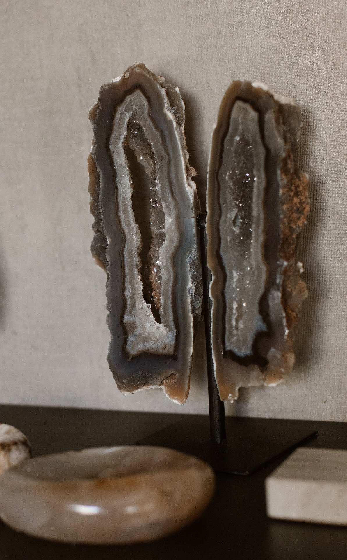 Twee halve agaat stukken in grijn/bruin. Zet hem op een centrale plek want zelfs de achterkant is prachtig..