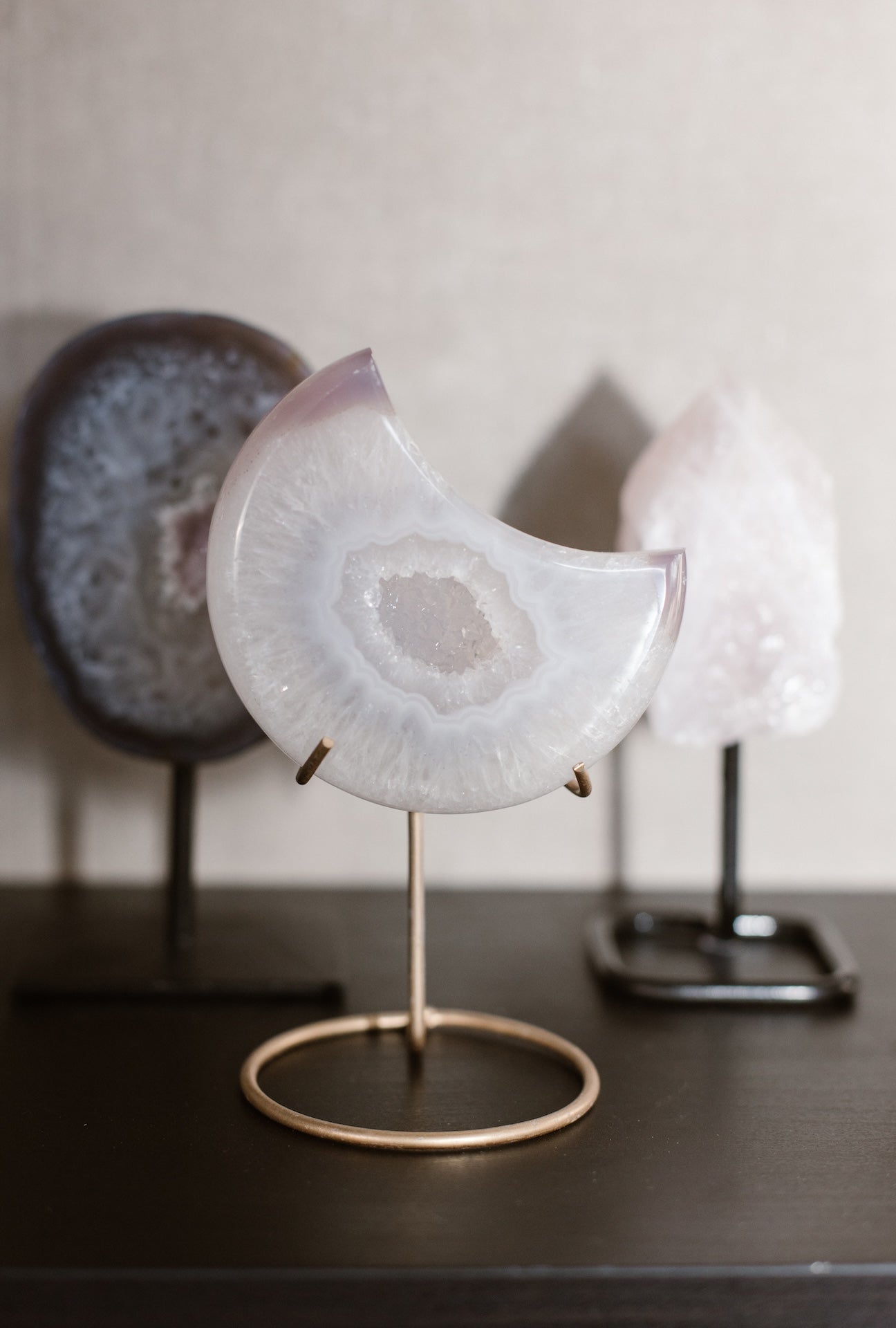 Prachtige agaat in de vorm van een maan. Zacht roze en grijs tinten met een sprankelend hart. Inclusief gouden standaard.