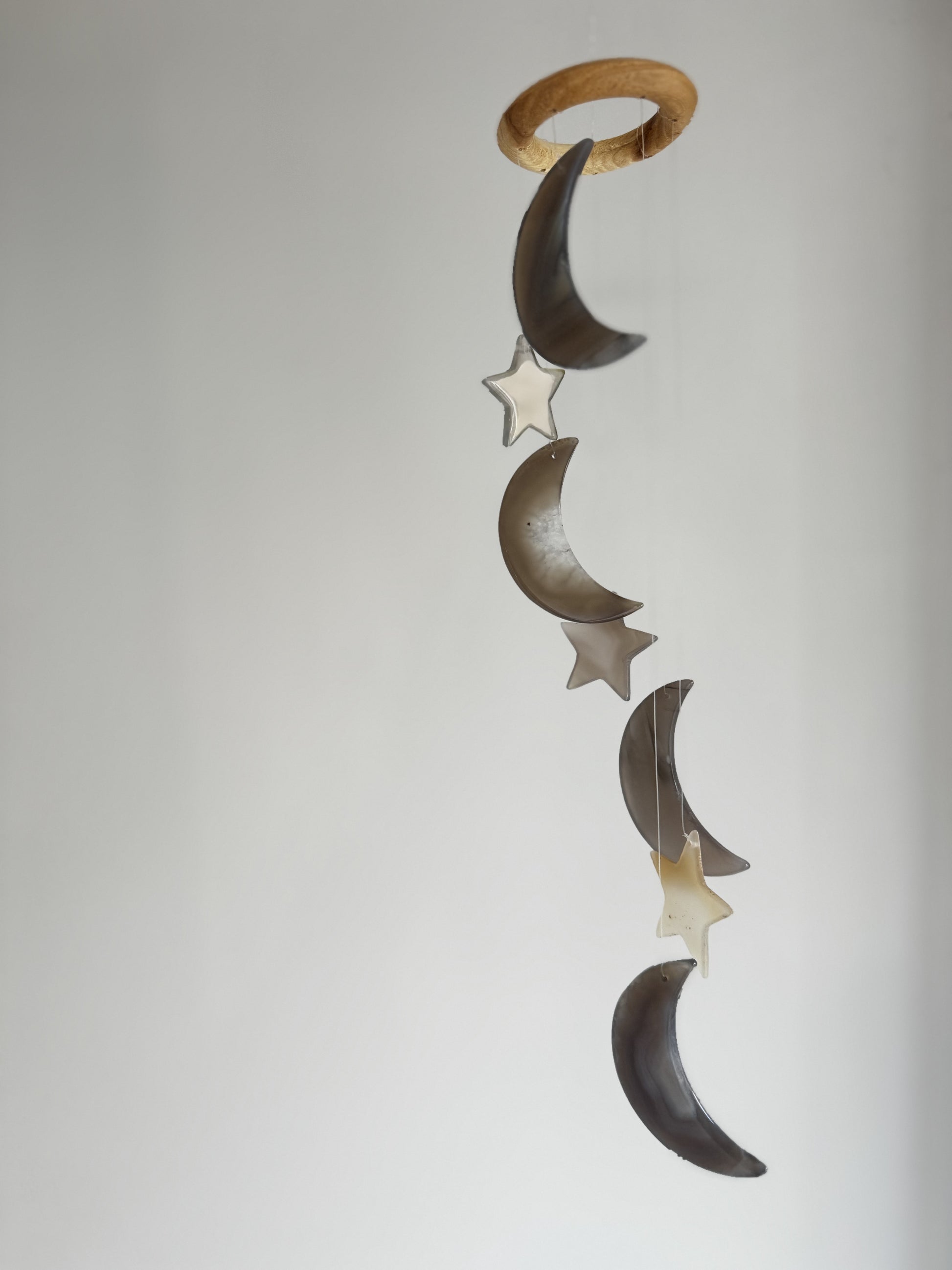 Wat is dit waanzinnig om als kraamcadeau te geven. Een mobiel van agaat schijven.