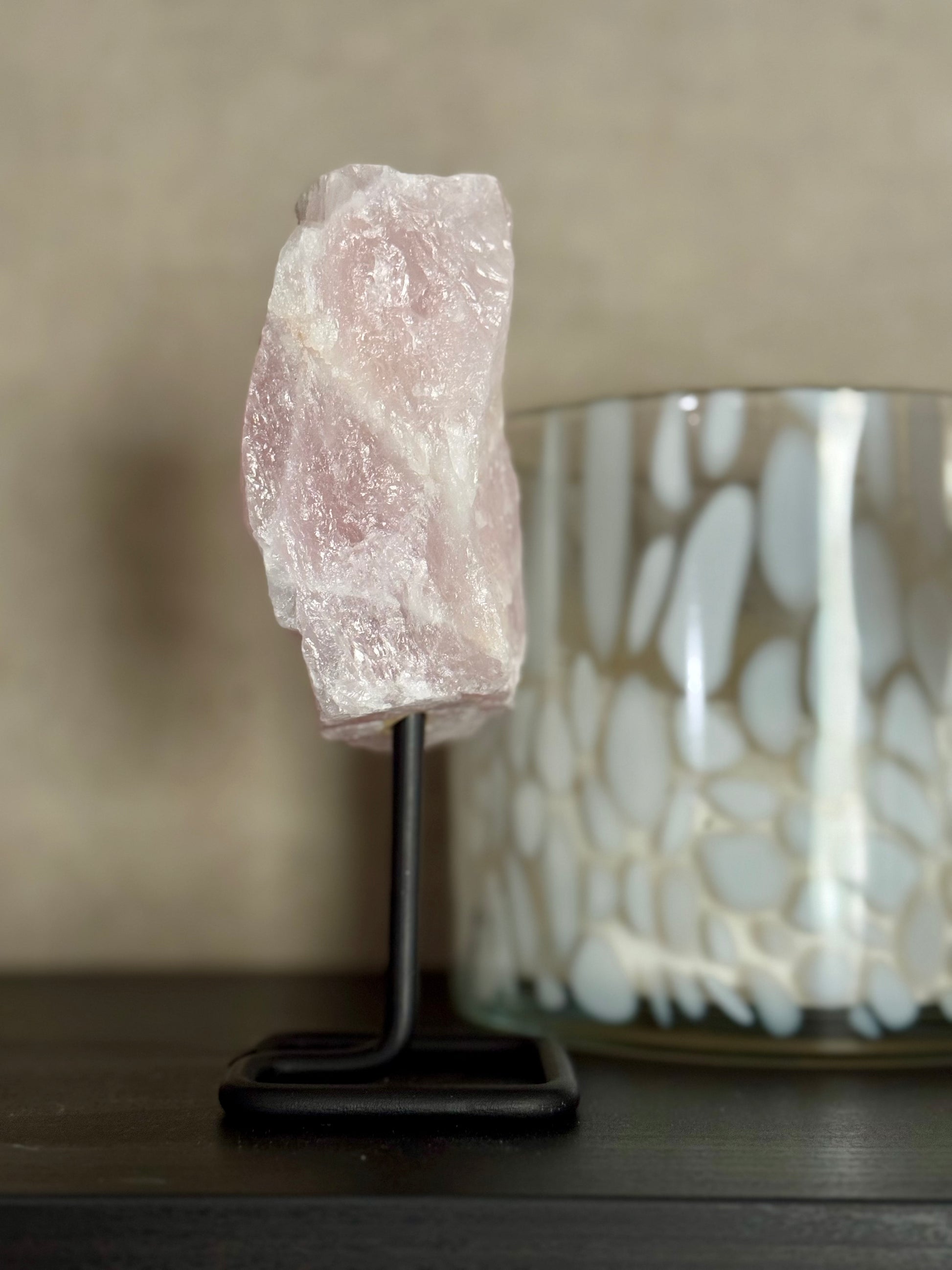 Een mooi brok ruwe rozenkwarts, op een mat zwarte standaard.